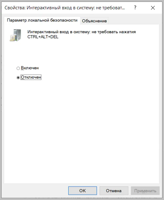 Если эта политика отключена, нажатие клавиш CTRL+ALT+DEL обязательно для любого пользователя перед входом в Windows.