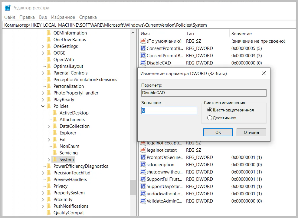 HKEY_LOCAL_MACHINE\SOFTWARE\Microsoft\Windows\CurrentVersion\Policies\System - Найдите параметр DisableCAD.