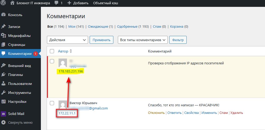 Следующее с чем я столкнулся — это некорректное отображении IP адресов посетителей. При настройках по-умолчанию весь трафик для WordPress регистрируется как исходящий от используемого обратного прокси-сервера, независимо от того, откуда на самом деле идёт этот трафик. И это проблема для определения IP-адреса в комментариях.