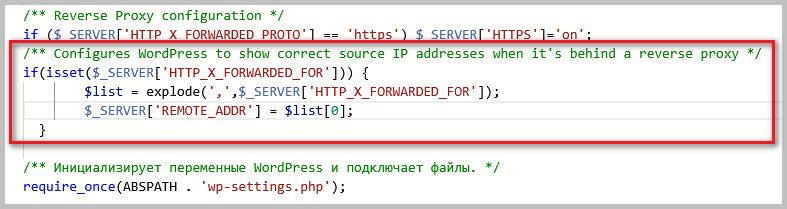 /** Reverse Proxy configuration Configures WordPress to show correct source IP addresses when it's behind a reverse proxy */ if(isset($_SERVER['HTTP_X_FORWARDED_FOR'])) { $list = explode(',',$_SERVER['HTTP_X_FORWARDED_FOR']); $_SERVER['REMOTE_ADDR'] = $list[0]; }